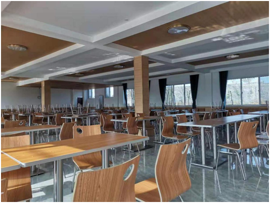 新餐廳是2層結(jié)構(gòu)。一樓為員工餐廳,位置很大,能容下100多人同時(shí)就餐。購(gòu)置了漂亮的餐桌,一人一個(gè)位置。