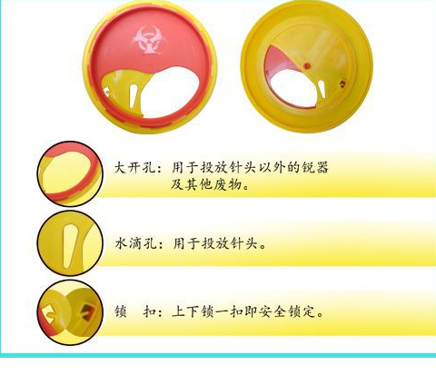 5、對于刀片或者玻璃等銳器,以及抽輸血用的注射器、輸液器等帶血的污染物品,可以直接扔入頂部的大開孔中。
