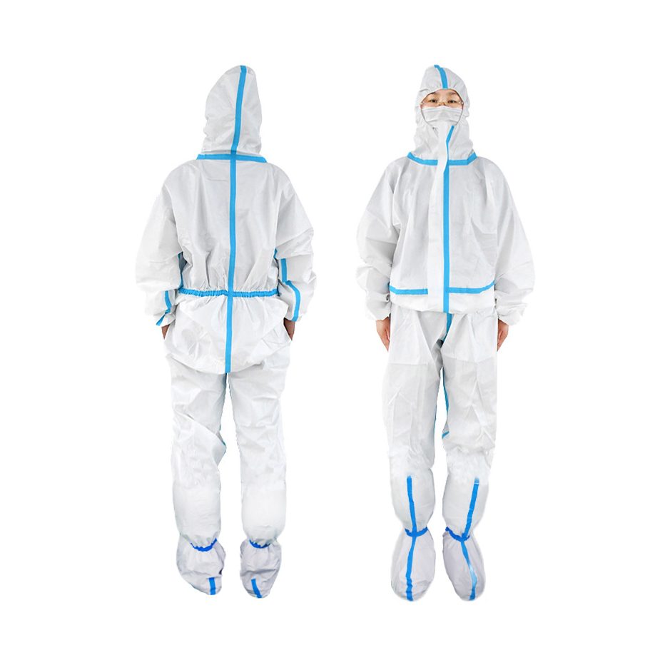 醫(yī)用一次性使用防護服為具有特定液體阻隔功能、特定強度、過濾效率阻燃性能、抗靜電和靜電衰減功能的適宜材料制成,分為連身式或分身式兩種,由連帽上衣、褲子組成,袖口、腳踝口為彈性收口,帽子面部收口及腰部收口可采用彈性收口、拉繩收口或搭扣。