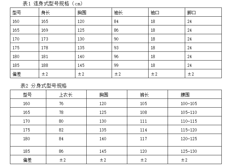 防護服號型分為160、165、170、175、180、185,型號規(guī)格見表1 和表2 。