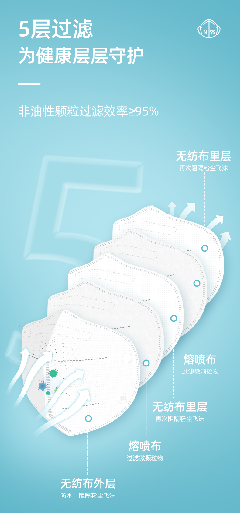 5、過濾效率:在氣體流量為85L/min情況下,口罩對(duì)非油性顆粒過濾效率≥95%。(過濾效率≥95% (1級(jí)))。