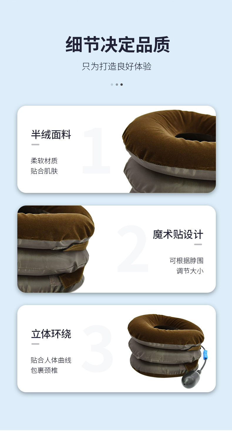 冠悅頸椎牽引器有兩種規(guī)格,材質(zhì)分為半絨和全絨兩種,都是三層充氣款,柔性立體支撐,環(huán)繞式牽引,360°立體支撐,較少頸椎問(wèn)題困擾,面料柔軟,貼服輕盈,干爽透氣,柔軟高彈,魔術(shù)貼設(shè)計(jì),可根據(jù)脖圍調(diào)節(jié)大小。