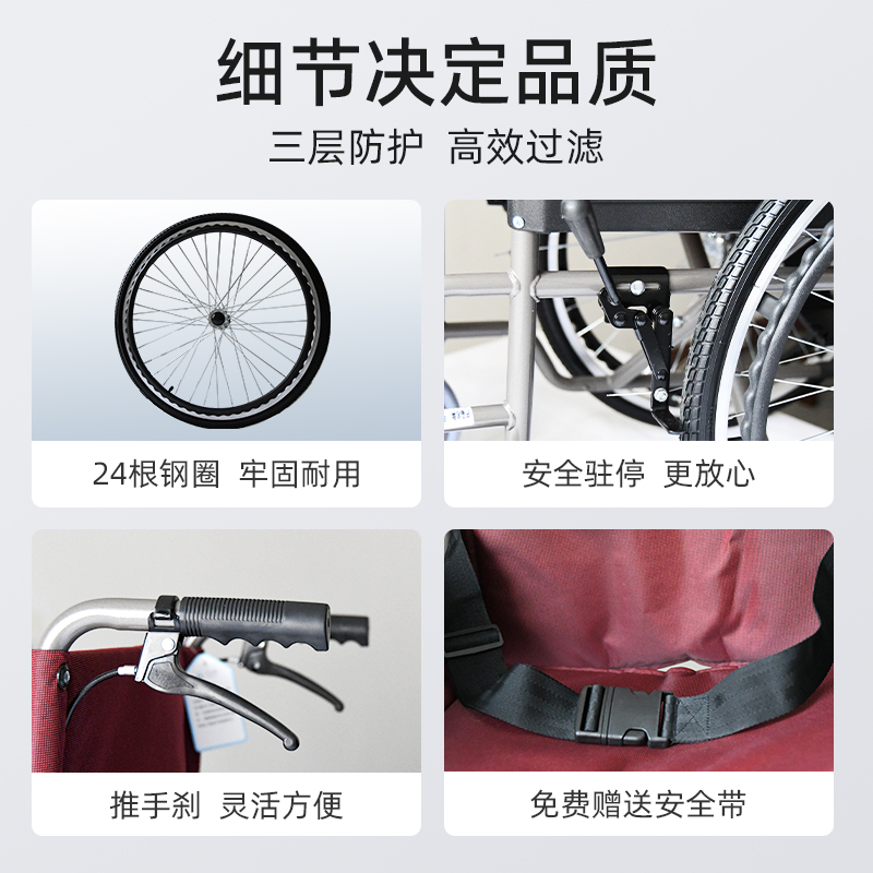 首先手動輪椅車的材質:采用加厚鋼材,注塑鋼材,厚度2.00.耐用材質,全噴塑,外形美觀。物理架構,堅韌不變形,承重100kg。坐墊采用牛津面料,內襯海綿,舒適透氣。